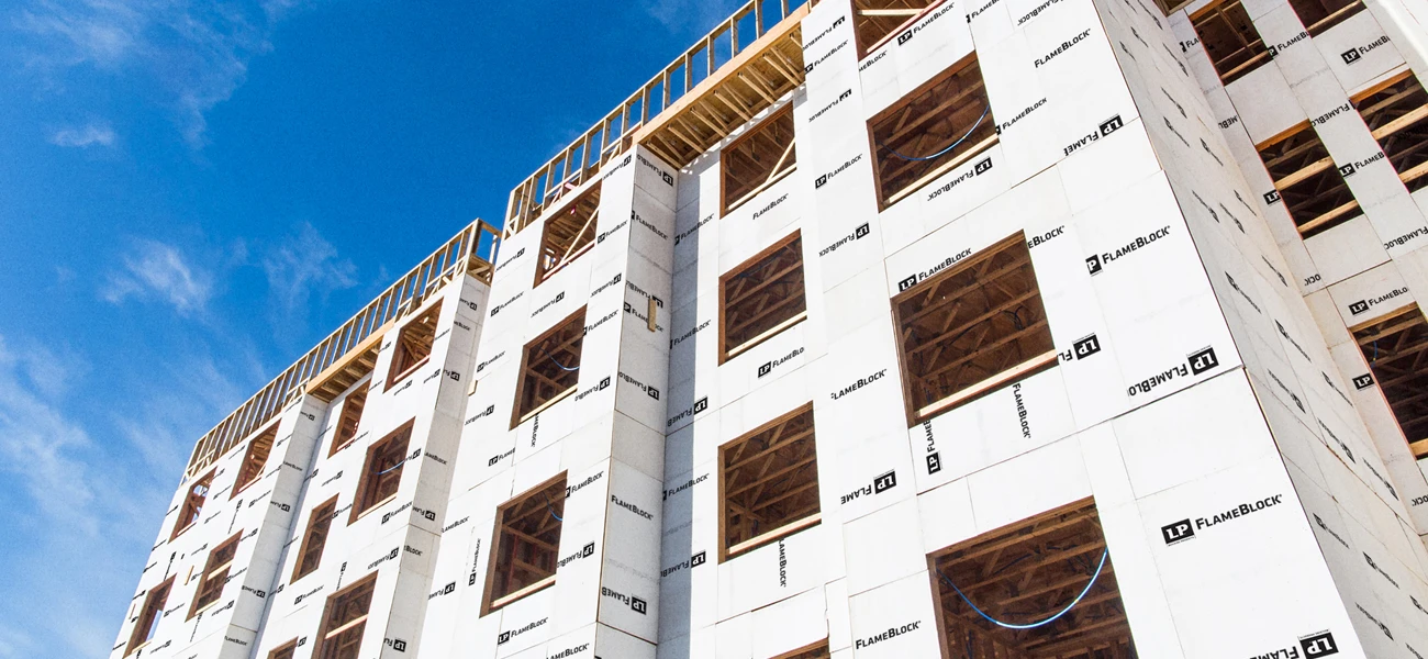 Helping you meet code is just one of the many versatile benefits of LP® FlameBlock® Fire-Rated Sheathing. Combining structural capacity and design flexibility, LP FlameBlock assemblies are evaluated to help meet code requirements for fire-resistance construction as a component of 1-hour and 2-hour wall assemblies and in roof deck applications.
