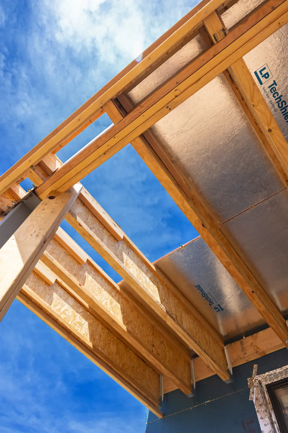 In desert climates, modern, flat-roof houses are a popular aesthetic. “Putting down a membrane so it’s watertight early in the cycle is important. Ducts are located in the attic, so LP TechShield Radiant Barrier is the best choice,” he explains.